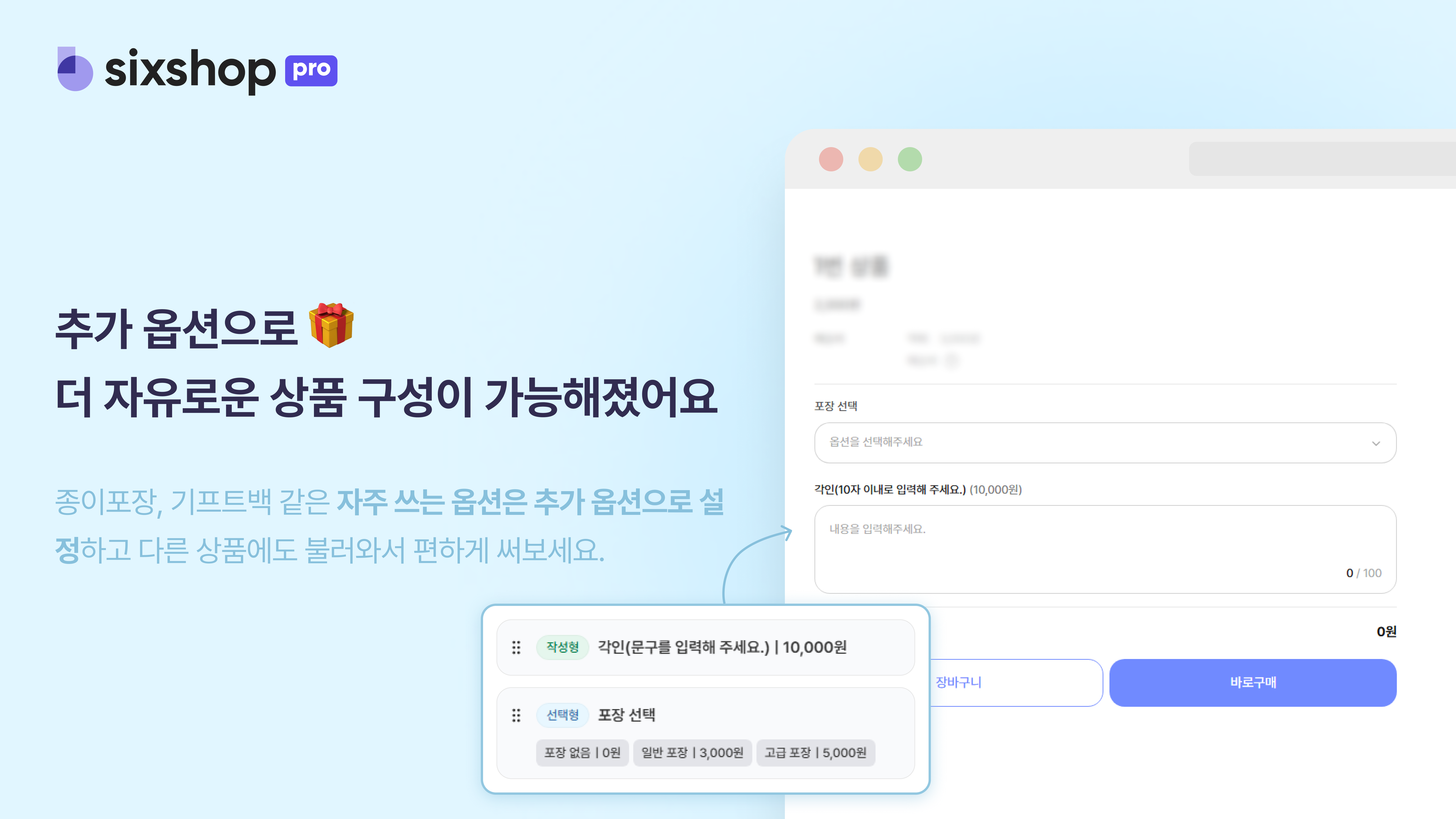 ์ด์ ๋ ํฌ์ฅ์ง์ฒ๋ผ ๊ผญ ์ ํํ๊ฑฐ๋ ์ง์ ์ ๋ ฅํด์ผ ํ๋ ํญ๋ชฉ๋ โ์ถ๊ฐ ์ต์ โ์ผ๋ก ๋ฐ๋ก ์ค์ ํ ์ ์์ด์. ์์ฑํ ์ต์ ์ผ๋ก ๊ธ์ก ์ค์ ๋ ๊ฐ๋ฅํด์ ธ์, ๊ตฌ๋งค์์๊ฒ ๋ ์ ๊ตํ ์ ํ์ง๋ฅผ ์ค ์ ์์ด์.