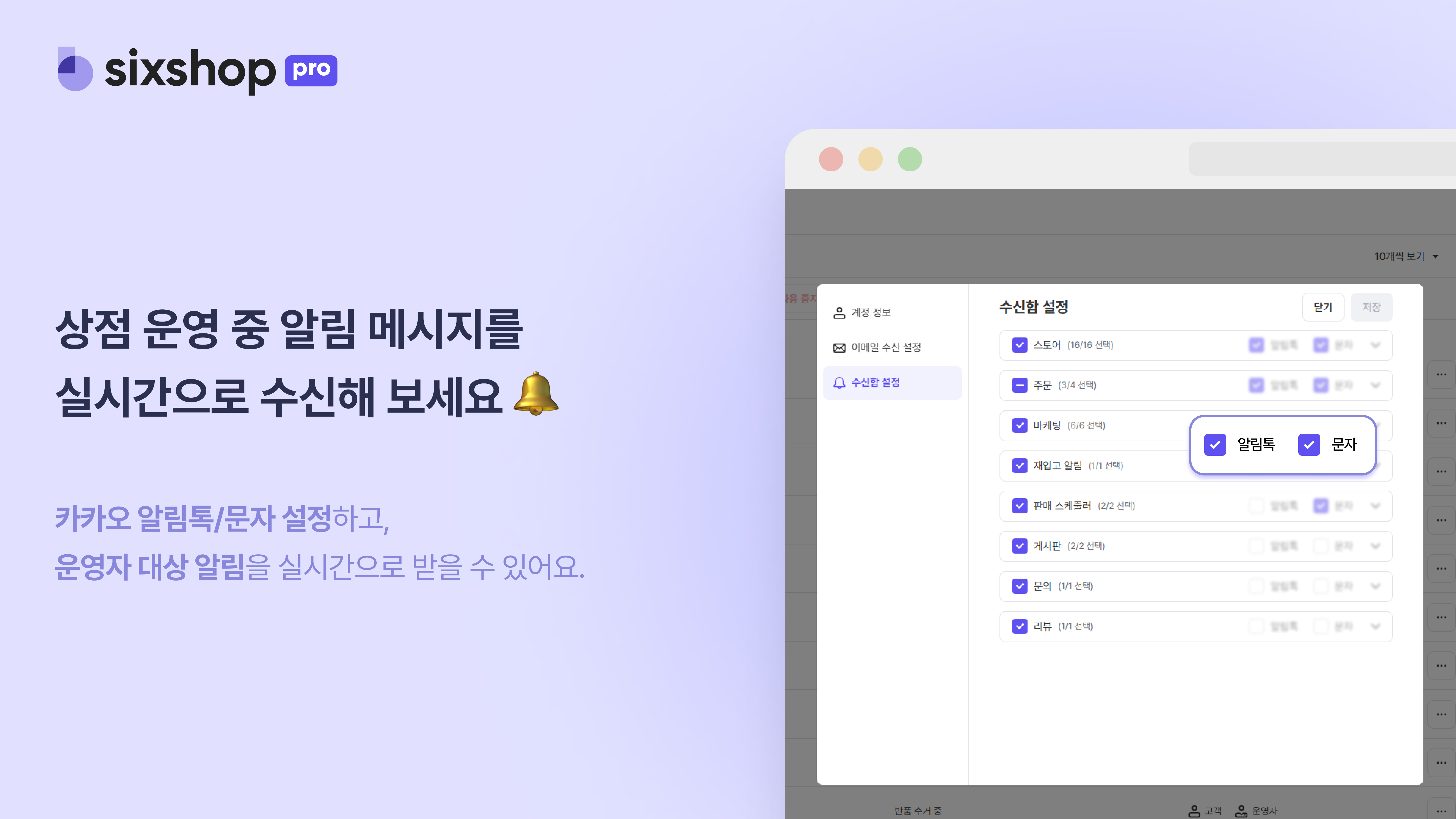 8๊ฐ ์ ํ์ ์๋ฆผ(์คํ ์ด, ๋ง์ผํ , ์ฌ์ ๊ณ ์๋ฆผ, ํ๋งค ์ค์ผ์ค๋ฌ, ์ฃผ๋ฌธ, ๊ฒ์ํ, ๋ฌธ์, ๋ฆฌ๋ทฐ) ์ค ์๋ฆผํก/๋ฌธ์๋ฅผ ๋ฐ์ ํ ์์ ๊ณผ ๋ฐ์ ์๋จ์ ๊ฐ๋ณ ์ ํํ ์ ์์ด์. โป ์ทจ์/๋ฐํ, ์ฌ๊ณ ํ์ ์์ ์ ์ถํ ์ ๊ณต๋ ์์ ์ด์์.