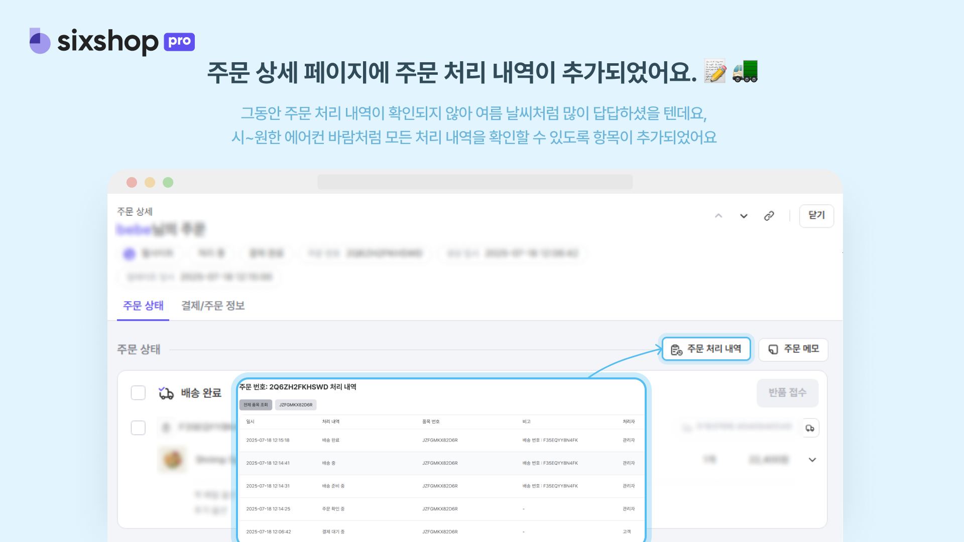 μ΄μ μ£Όλ¬Έ μμΈ νμ΄μ§μμ μ£Όλ¬Έ μ²λ¦¬ λ΄μμ νλμ νμΈν μ μμ΄μ! π