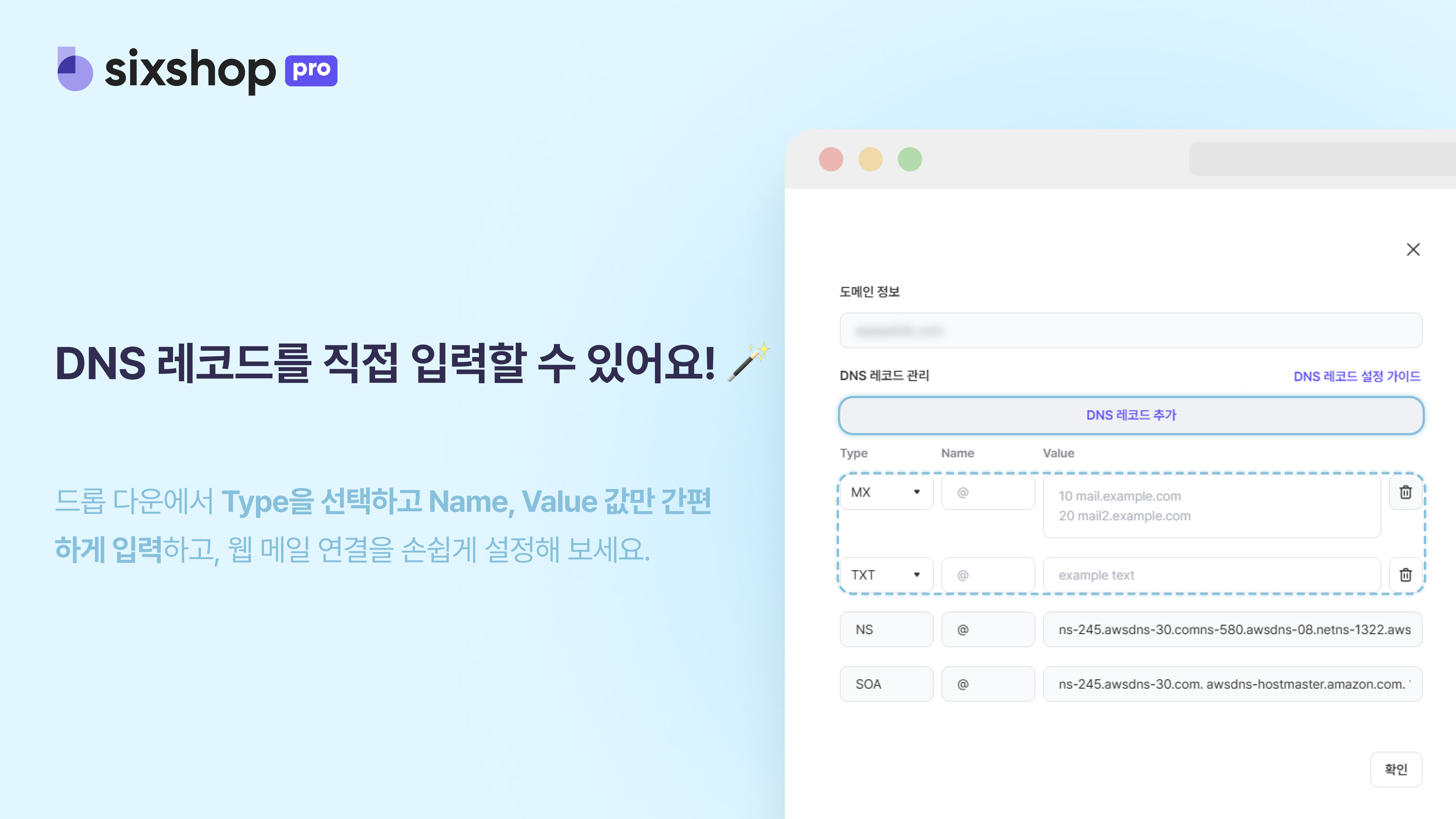 DNS ๋ ์ฝ๋๋ฅผ ์ง์ ์ ๋ ฅํ ์ ์์ด, ๋ ์ ์ฐํ ๋๋ฉ์ธ ์ค์ ์ด ๊ฐ๋ฅํด์ก์ด์. ๐จ๐ปโ๐ป ์ด์ ๊ณ ๊ฐ์ผํฐ์ ์์ฒญํ์ง ์์๋ ์ง์ ๋น ๋ฅด๊ฒ ์ค์ ํ ์ ์์ด์.