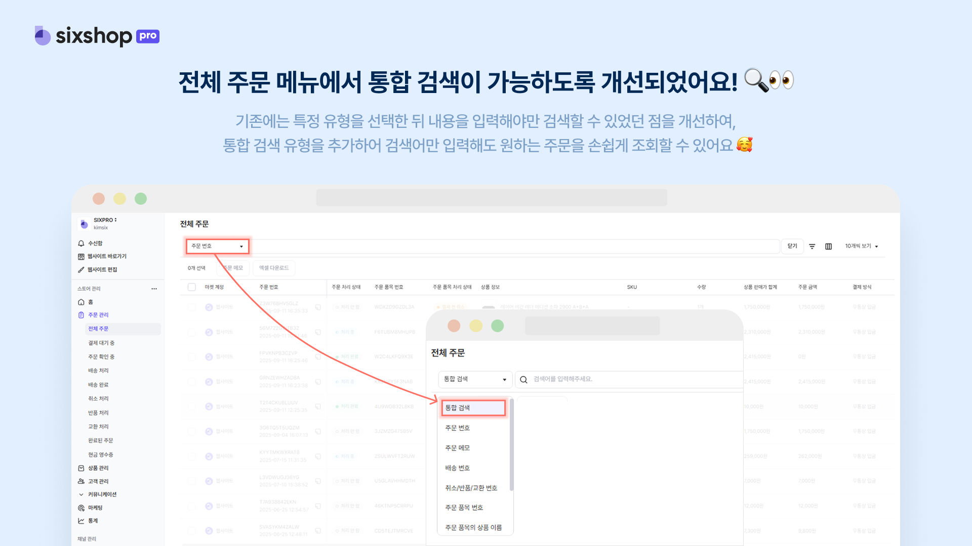기존에는 주문을 조회할 때 특정 항목(예: 주문번호, 주문자명 등)을 먼저 선택한 뒤