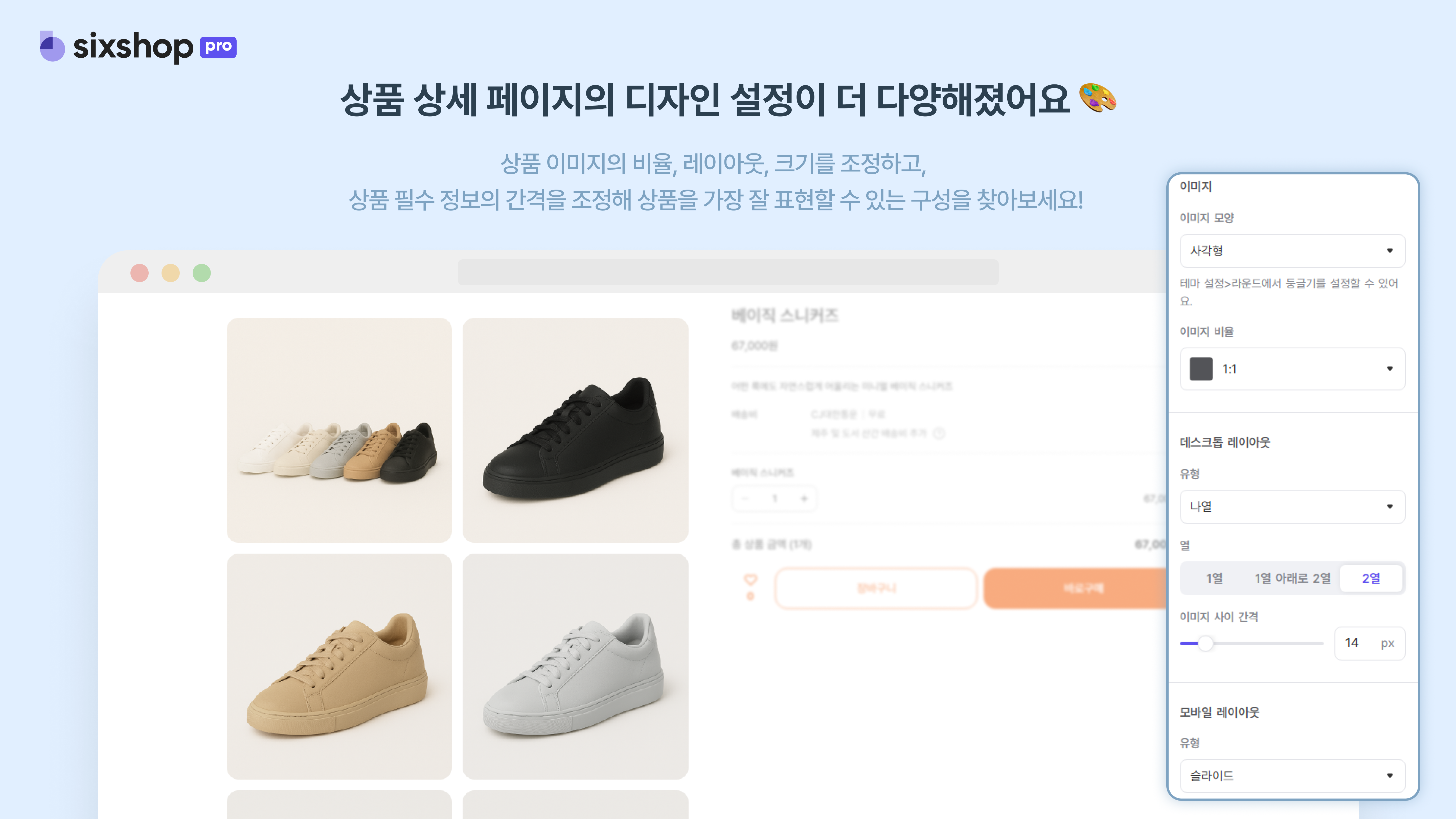 ์ํ ์ด๋ฏธ์ง ๋ ์ด์์์ด ๋ฐ๋๋ฉด ์์ธ ํ์ด์ง๊ฐ ๋ฌ๋ผ์ ธ์! ๐ง๐ป ์์ธ ํ์ด์ง์์ ๊ฐ์ฅ ๋จผ์ ๋ณด์ด๋ ์ํ ์ด๋ฏธ์ง์ ํฌ๊ธฐ, ๋น์จ, ๋ ์ด์์๊น์ง์ง์ ์ค์ ํ ์ ์์ด์.